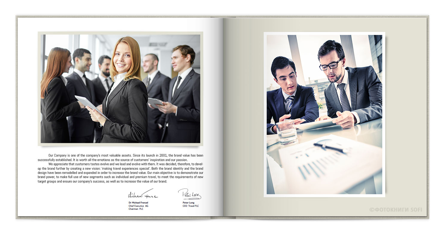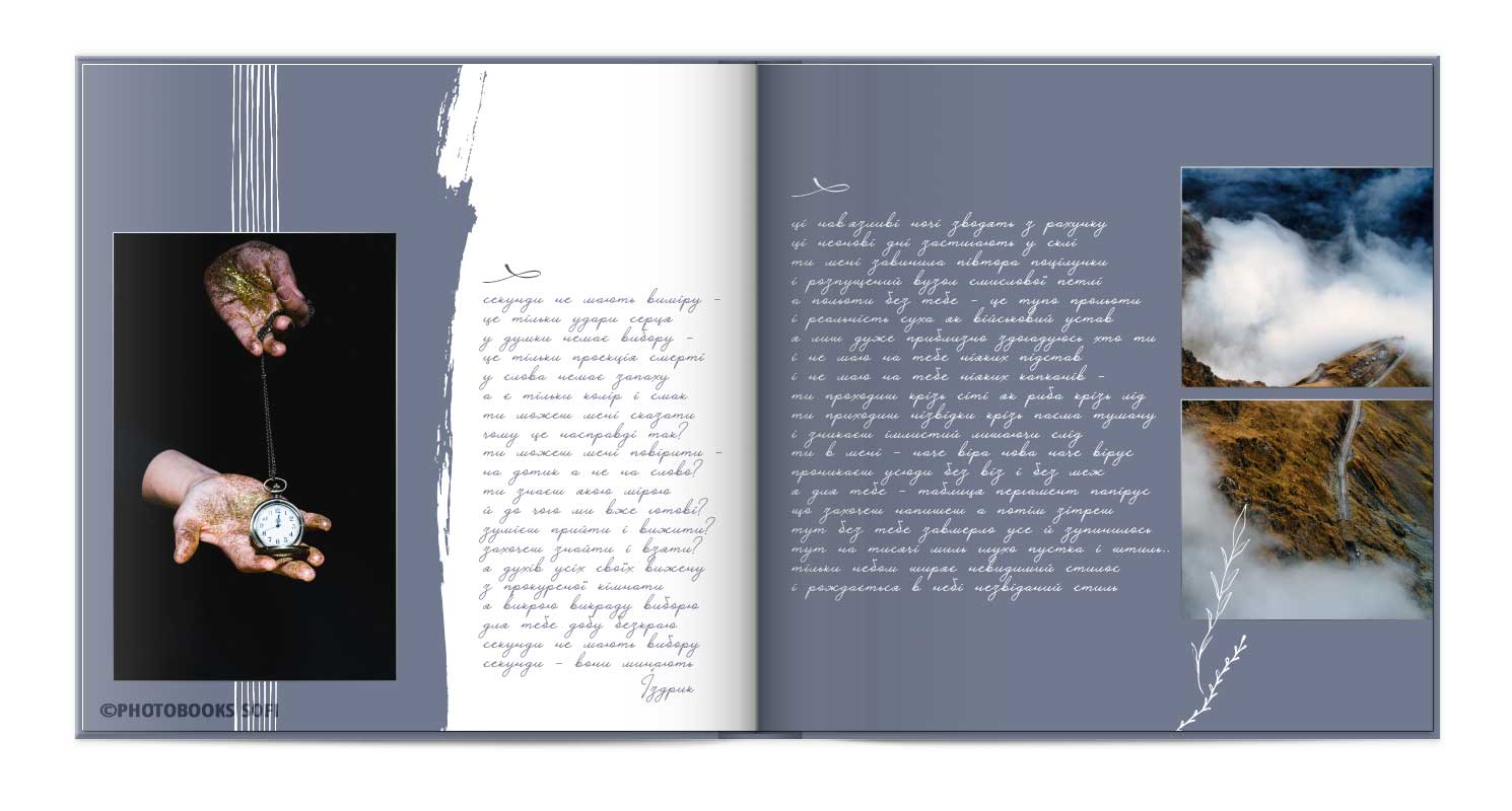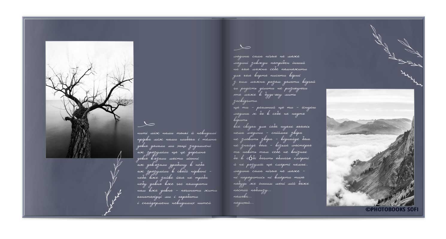 В фотокнигах використовується фотодрук на преміальному фотопапері та твердий, зносостійкий варіант палітурки